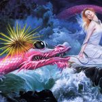 The man was not angry, but responded patiently to Tokoyo’s intervention. He explained to her that there was a mysterious dragon named Yofune-Nushi who lived in a cave deep beneath the Oki Islands. For decades, he had terrorized Oki’s small, coastal fishing village. Every year, on June 13th, he forced the people of the nearby village to sacrifice a virgin to him. He threatened to conjure up a terrific storm and destroy their fishing fleet if they did not comply. Fishing was the only source of income to these humble people, so they had no choice but to submit. It was this priest’s sad duty to superintend this ceremony, which Tokoyo interrupted.